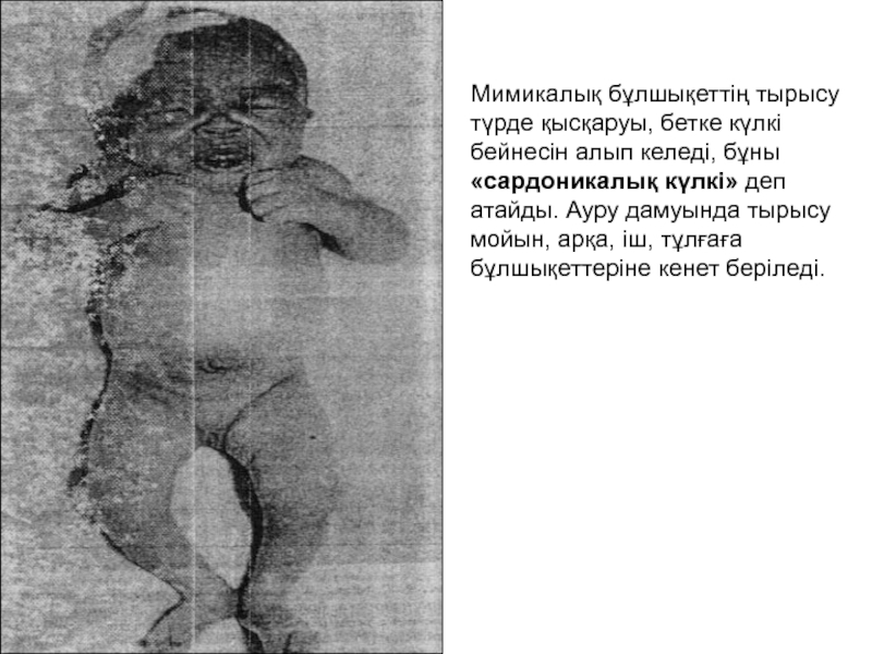 алып келеді, бұны «сардоникалық күлкі» деп атайды. Ауру дамуында тырысу