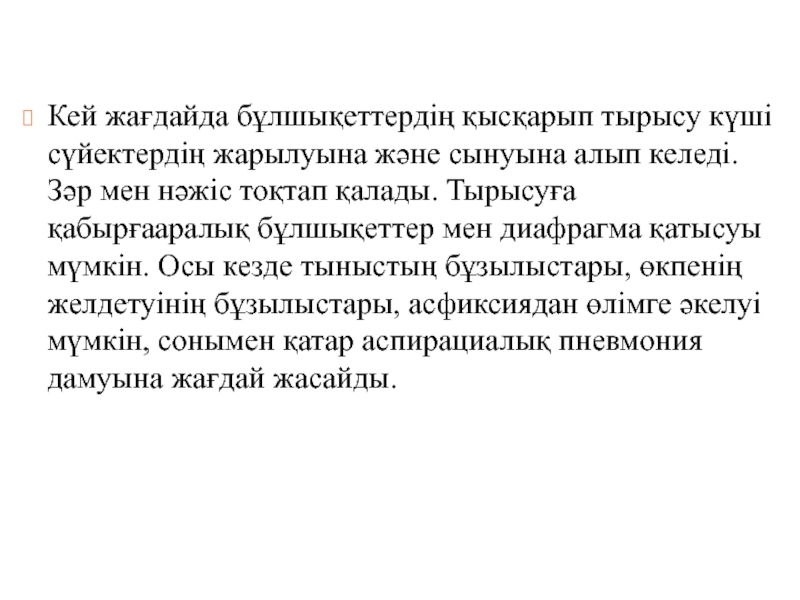 тоқтап қалады. Тырысуға қабырғааралық бұлшықеттер мен диафрагма қатысуы мүмкін. Осы кезде тыныстың бұзылыстары, өкпенің желдетуінің бұзылыстары, асфиксиядан өлімге әкелуі мүмкін, сонымен қатар аспирациалық пневмония дамуына жағдай жасайды.