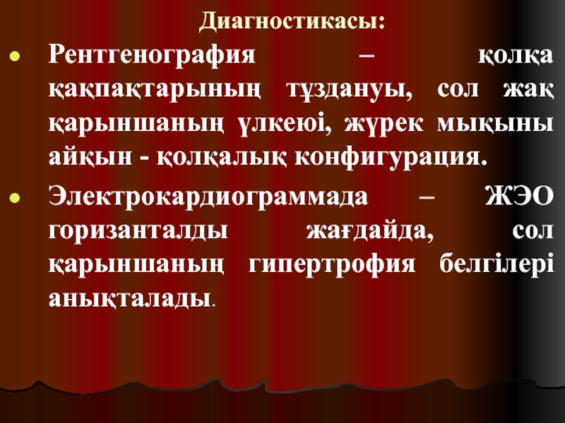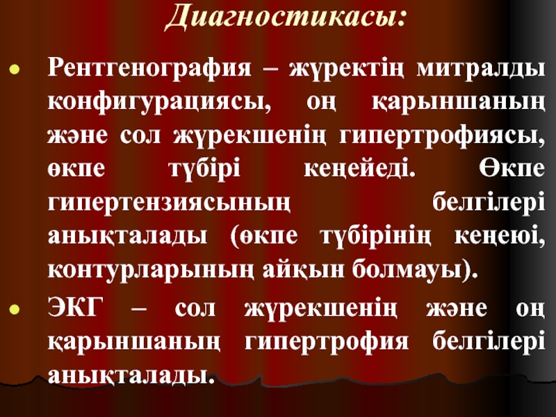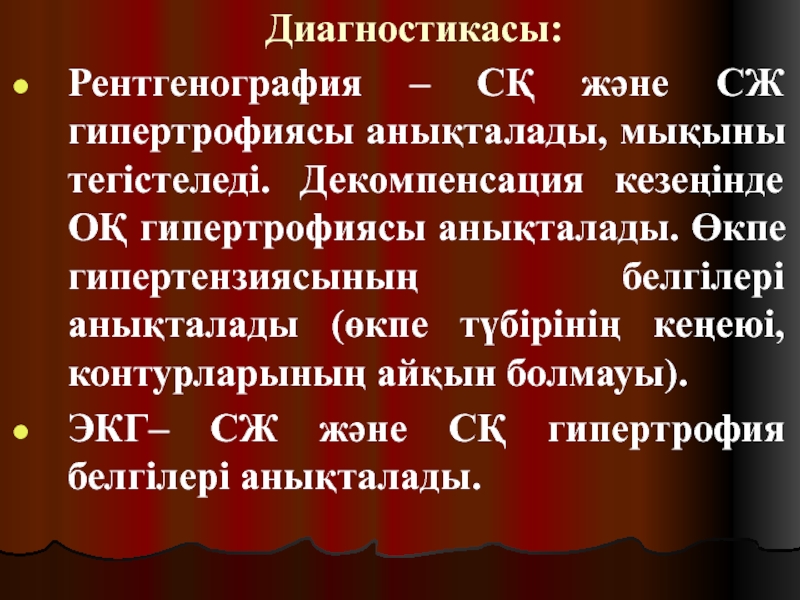 Рентгенография – СҚ және СЖ гипертрофиясы анықталады, мықыны тегістеледі. Декомпенсация