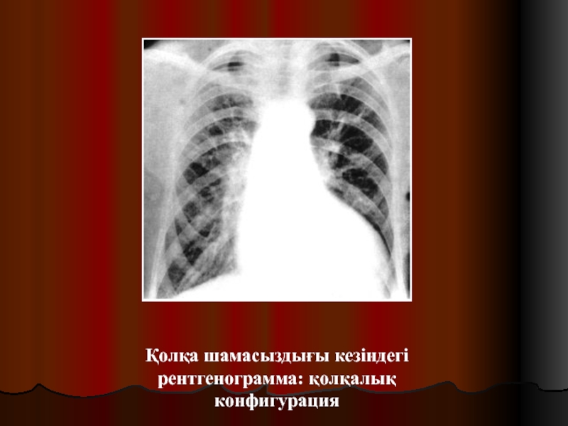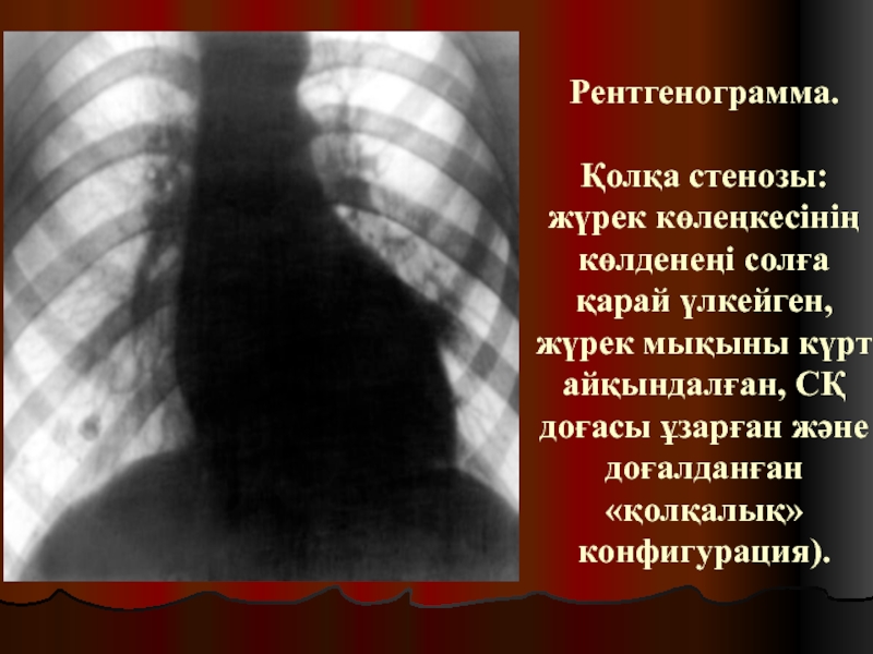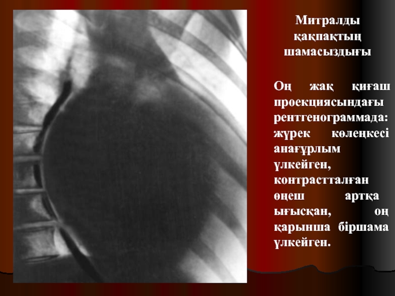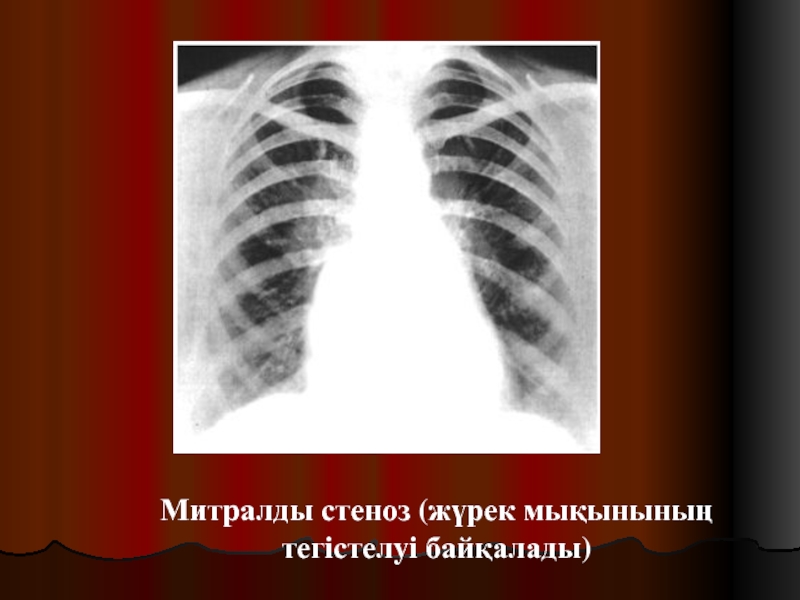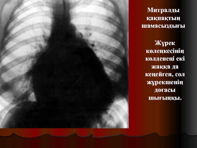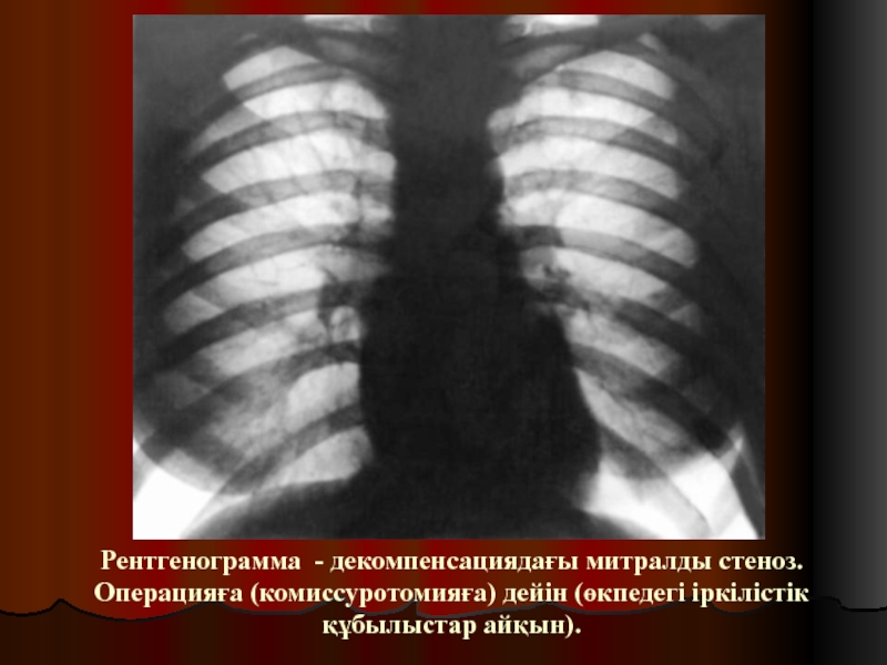Слайд 32Рентгенограмма - декомпенсациядағы митралды стеноз. Операцияға (комиссуротомияға) дейін (өкпедегі іркілістік