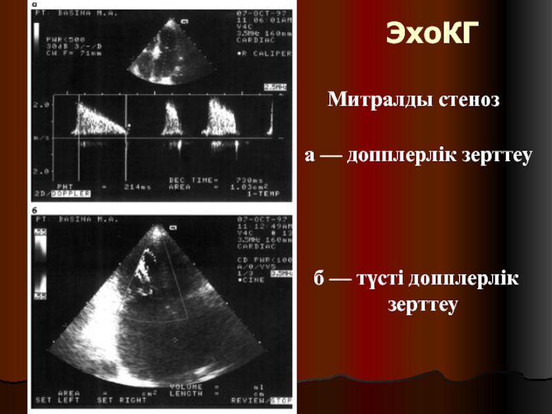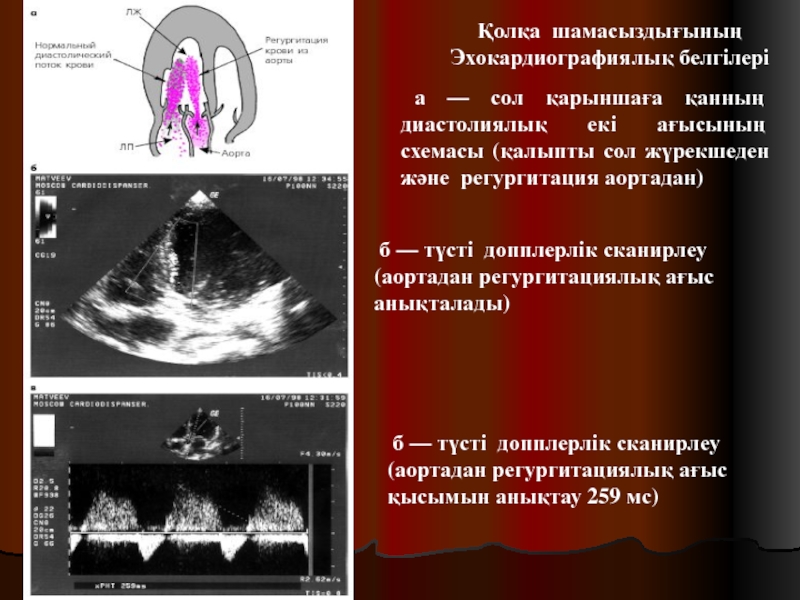 б — түсті допплерлік сканирлеу (аортадан регургитациялық ағыс қысымын анықтау 259 мс)