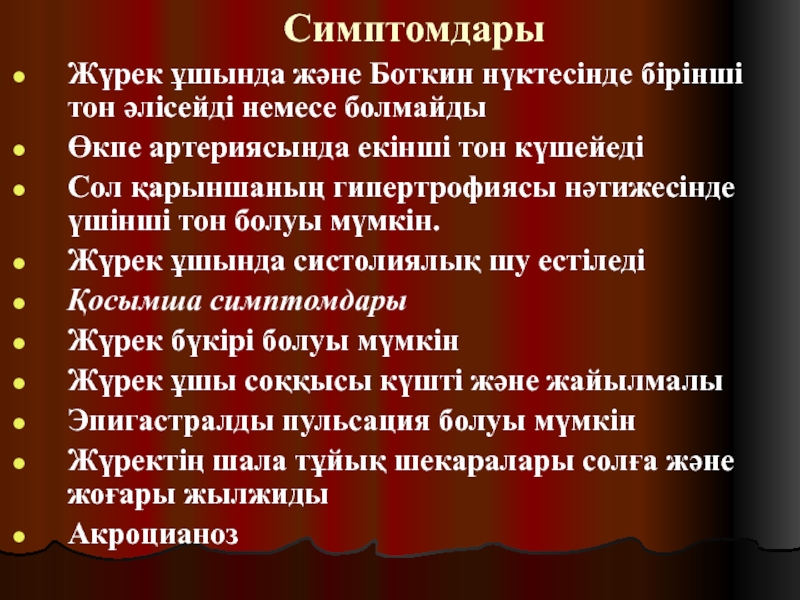 Жүрек ұшында және Боткин нүктесінде бірінші тон әлісейді немесе болмайды