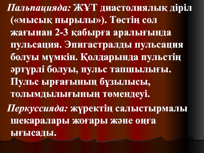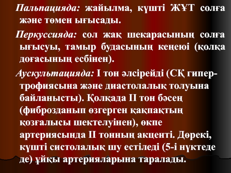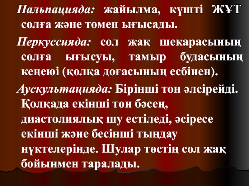 Слайд 52 Пальпацияда: жайылма, күшті ЖҰТ солға және төмен ығысады.