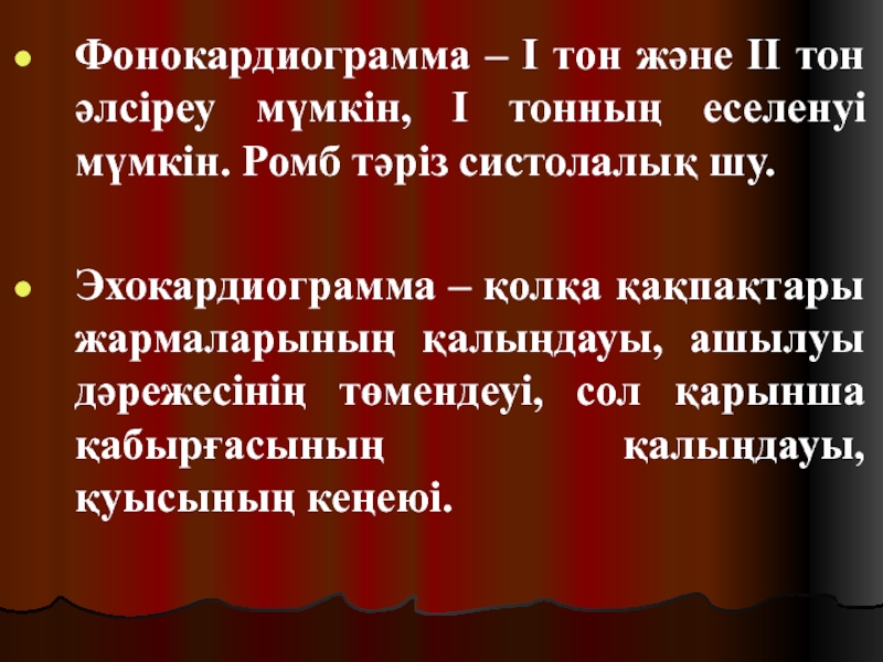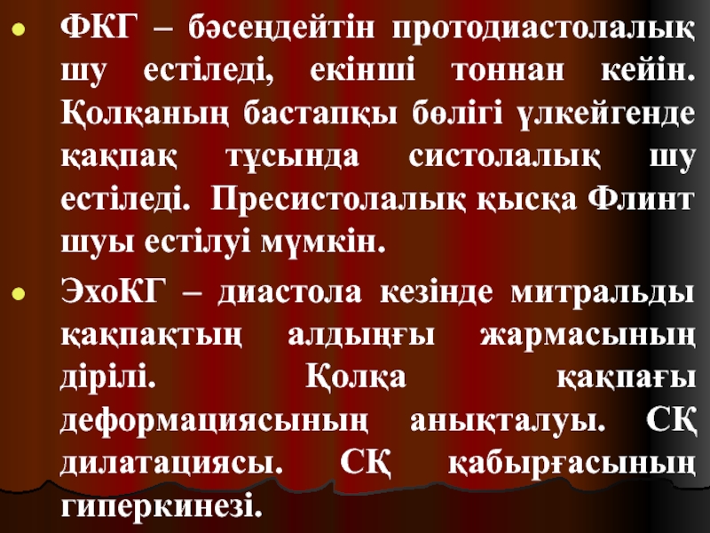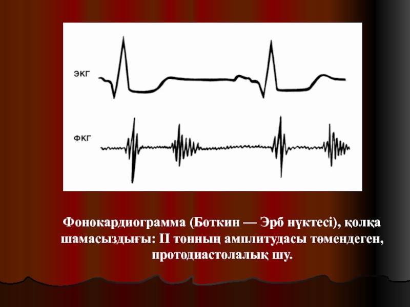 Слайд 42ФКГ – бәсеңдейтін протодиастолалық шу естіледі, екінші тоннан кейін. Қолқаның