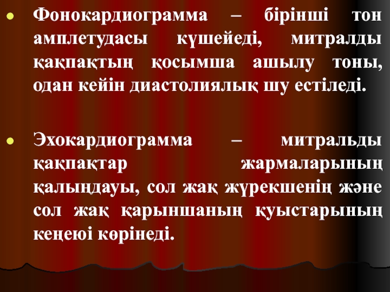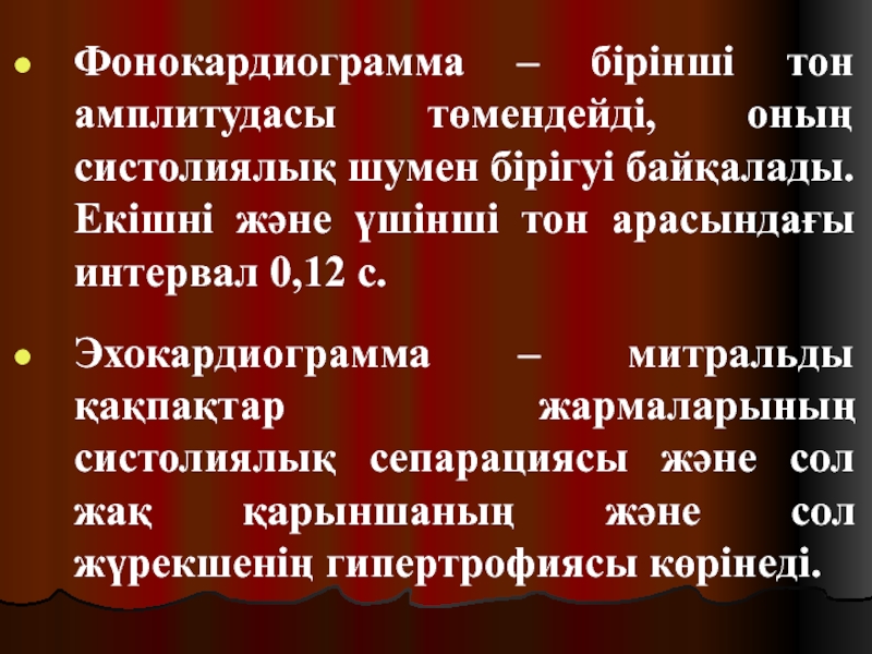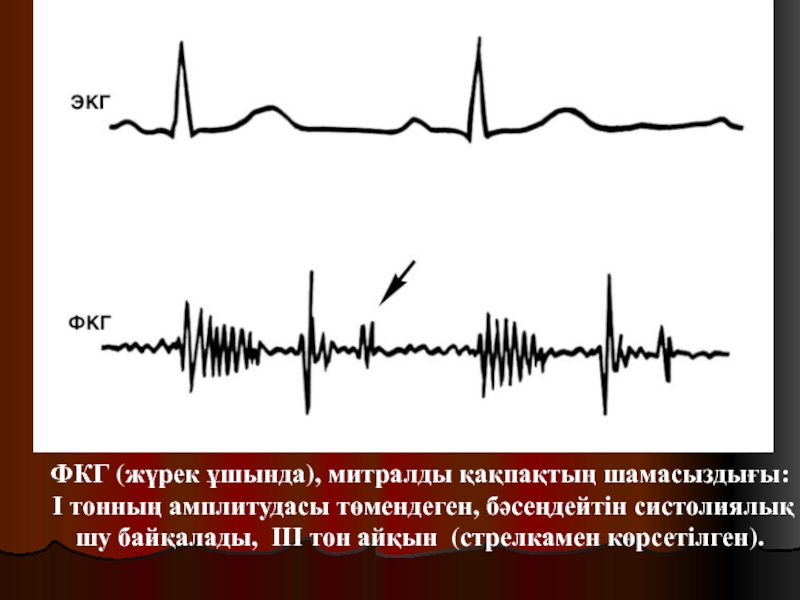 Слайд 14ФКГ (жүрек ұшында), митралды қақпақтың шамасыздығы: