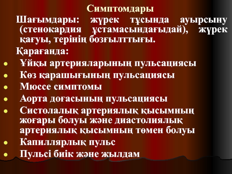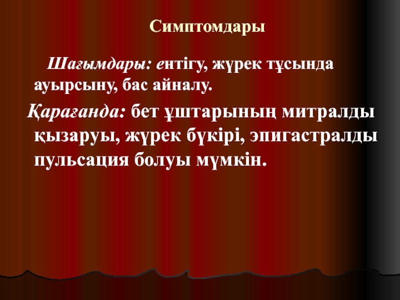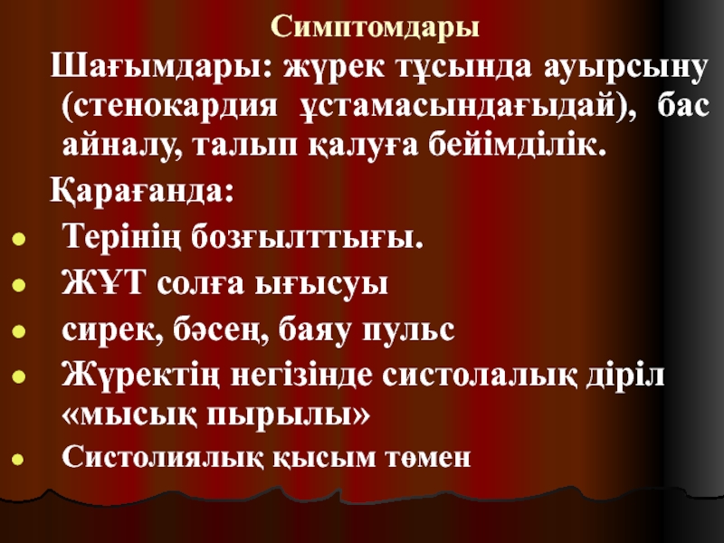 Шағымдары: жүрек тұсында ауырсыну (стенокардия ұстамасындағыдай), бас айналу, талып қалуға