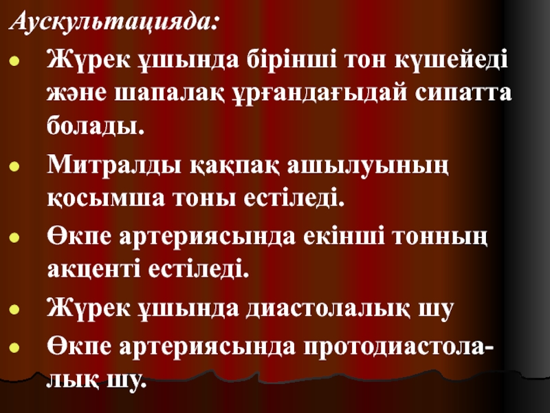Бірінші тон әлсірейді. Қолқада екінші тон бәсең, диастолиялық шу естіледі, әсіресе екінші және бесінші тыңдау нүктелерінде. Шулар төстің сол жақ бойынмен таралады.