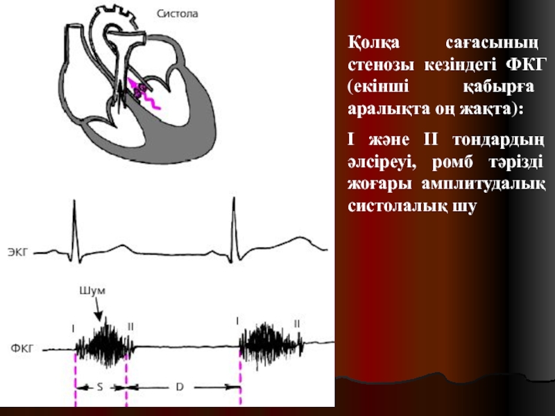 Слайд 55Қолқа сағасының стенозы кезіндегі ФКГ (екінші қабырға аралықта оң жақта):