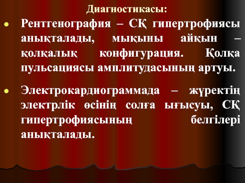 Рентгенография – СҚ гипертрофиясы анықталады, мықыны айқын – қолқалық конфигурация.