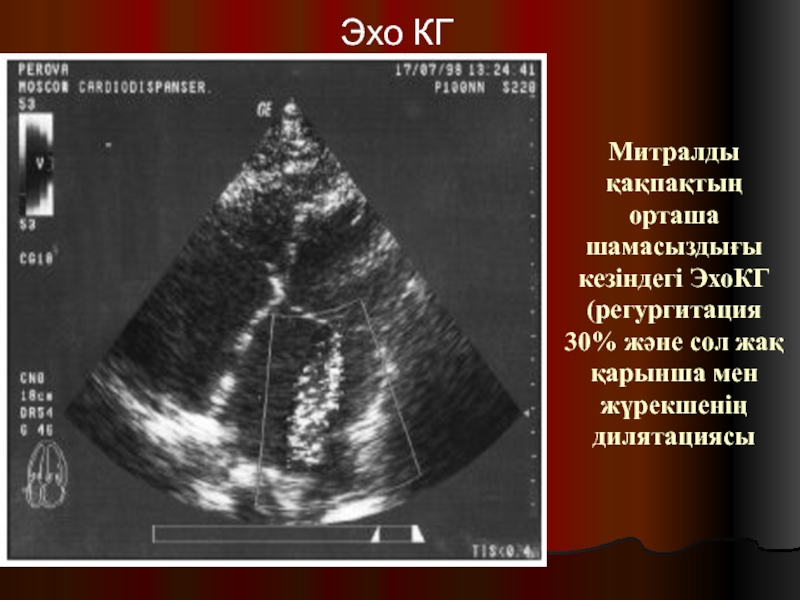 Слайд 15Митралды қақпақтың орташа шамасыздығы кезіндегі ЭхоКГ (регургитация 30% және сол