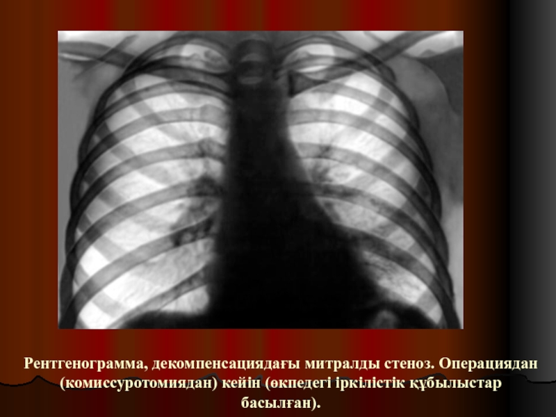 Слайд 33Рентгенограмма, декомпенсациядағы митралды стеноз. Операциядан (комиссуротомиядан) кейін (өкпедегі іркілістік құбылыстар