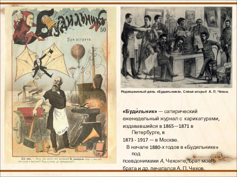 Редакционный день «Будильника». Слева второй А. П. Чехов.
