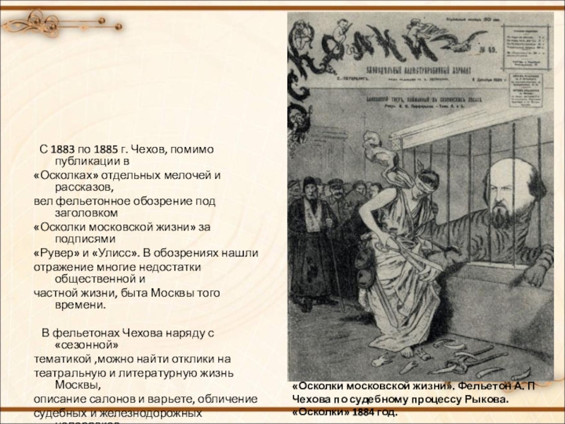 «Осколки московской жизни». Фельетон А. П Чехова по судебному процессу Рыкова. «Осколки» 1884 год.