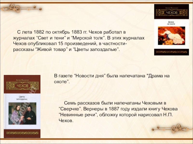 Семь рассказов были напечатаны Чеховым в “Сверчке”. Вернеры в 1887 году издали книгу Чехова “Невинные речи”, обложку которой нарисовал Н.П. Чехов.