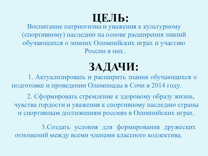 2. Сформировать стремление к здоровому образу жизни, чувства гордости и уважения к спортивному наследию страны и спортивным достижениям россиян в Олимпийских играх.