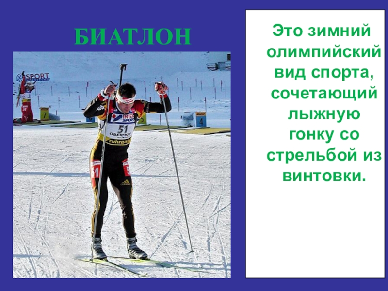 БИАТЛОН Это зимний олимпийский вид спорта, сочетающий лыжную гонку со стрельбой из винтовки.