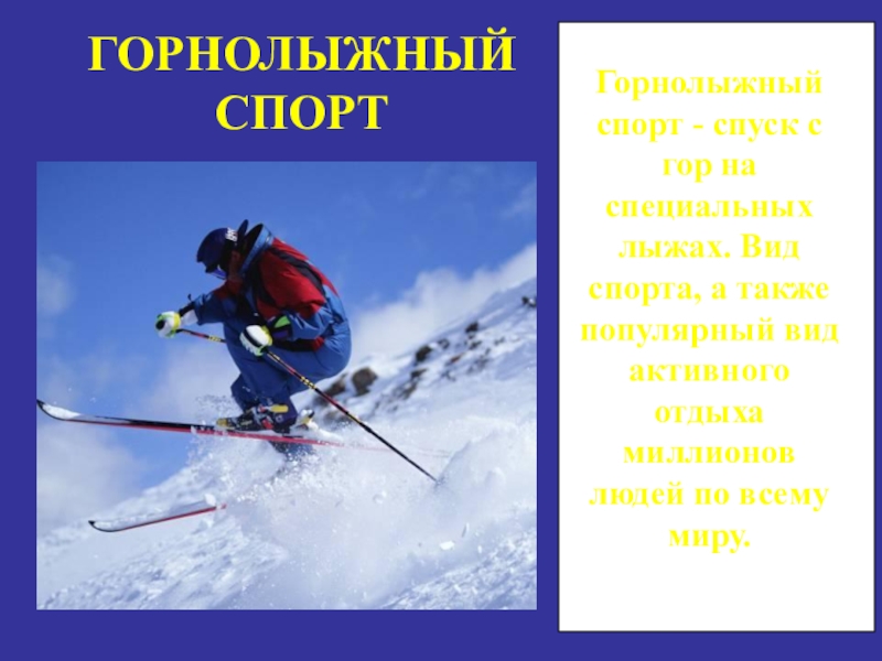 ГОРНОЛЫЖНЫЙ СПОРТГорнолыжный спорт - спуск с гор на специальных лыжах. Вид спорта, а также популярный вид активного