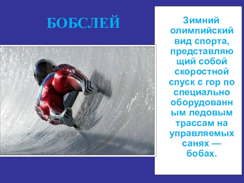 БОБСЛЕЙ  Зимний олимпийский вид спорта, представляющий собой скоростной спуск с гор по специально оборудованным ледовым трассам