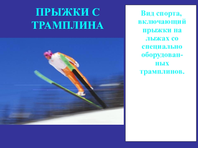 ПРЫЖКИ С ТРАМПЛИНА  Вид спорта, включающий прыжки на лыжах со специально оборудован-ных трамплинов.