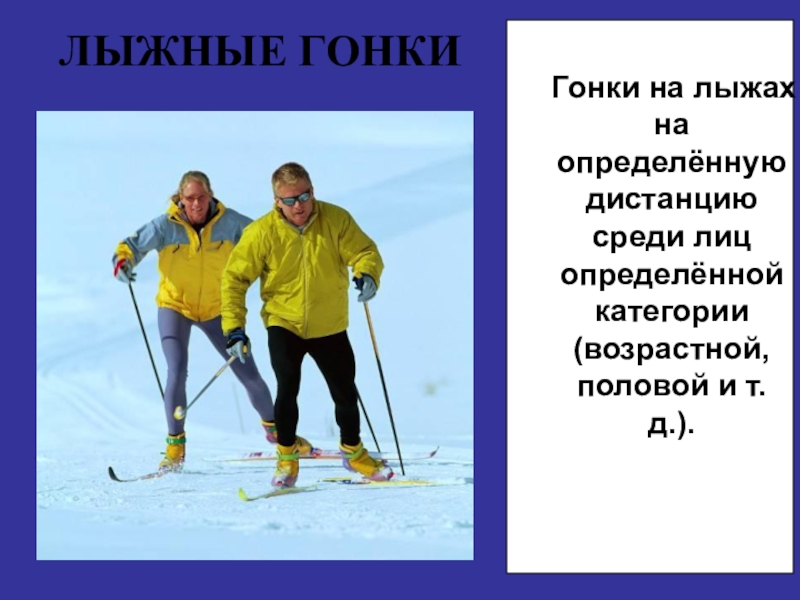 ЛЫЖНЫЕ ГОНКИ  Гонки на лыжах на определённую дистанцию среди лиц определённой категории (возрастной, половой и т.