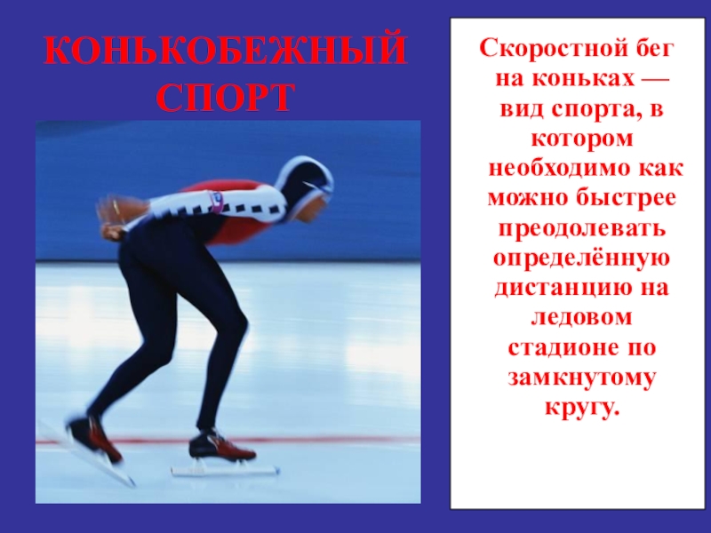 КОНЬКОБЕЖНЫЙ СПОРТ Скоростной бег на коньках —вид спорта, в котором необходимо как можно быстрее преодолевать определённую дистанцию на ледовом стадионе по замкнутому кругу.
