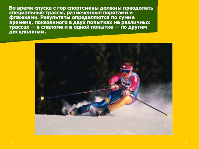 преодолеть специальные трассы, размеченные воротами и флажками. Результаты определяются по