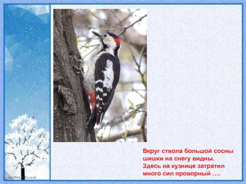 Вкруг ствола большой сосны шишки на снегу видны. Здесь на кузнице затратил много сил проворный ….