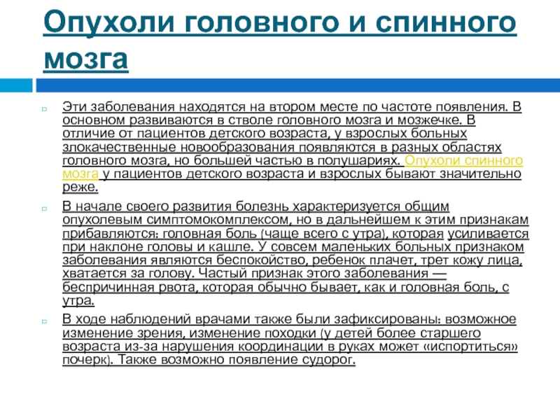 и мозжечке. В отличие от пациентов детского возраста, у взрослых больных злокачественные новообразования появляются в разных областях головного мозга, но большей частью в полушариях. Опухоли спинного мозга у пациентов детского возраста и взрослых бывают значительно реже.