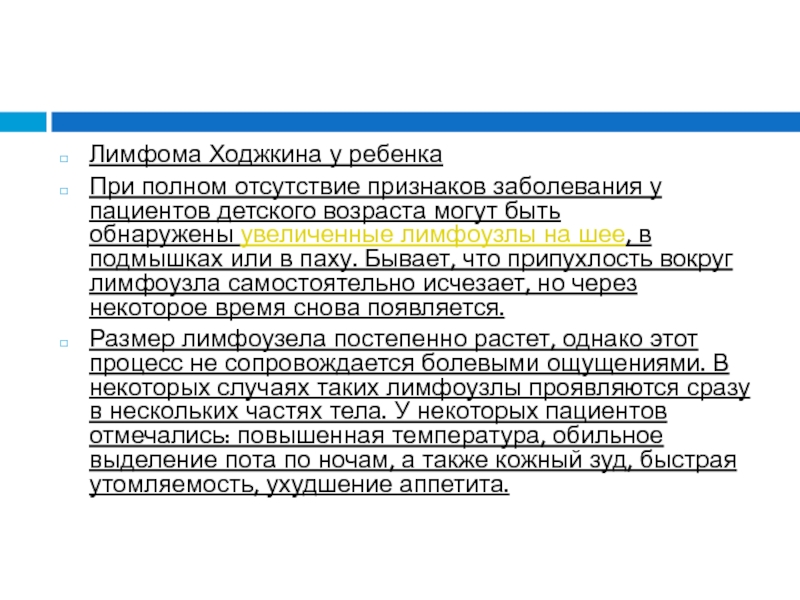 Размер лимфоузела постепенно растет, однако этот процесс не сопровождается болевыми ощущениями. В некоторых случаях таких лимфоузлы проявляются сразу в нескольких частях тела. У некоторых пациентов отмечались: повышенная температура, обильное выделение пота по ночам, а также кожный зуд, быстрая утомляемость, ухудшение аппетита.