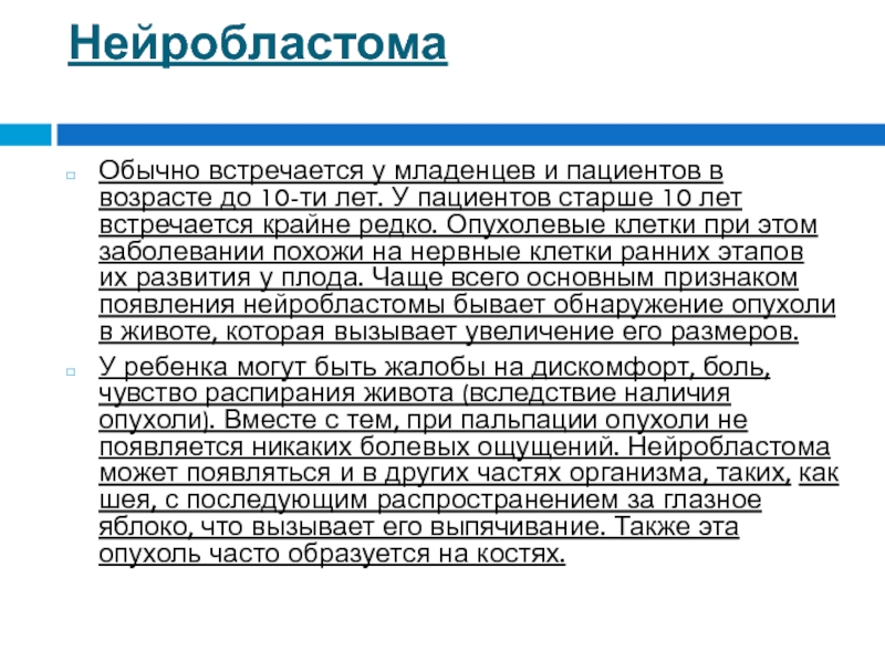 клетки при этом заболевании похожи на нервные клетки ранних этапов их развития у плода. Чаще всего основным признаком появления нейробластомы бывает обнаружение опухоли в животе, которая вызывает увеличение его размеров.