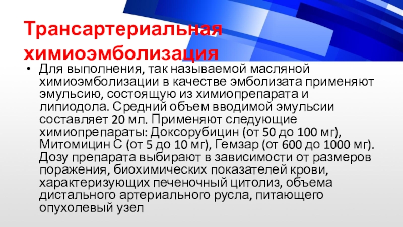 эмульсии составляет 20 мл. Применяют следующие химиопрепараты: Доксорубицин (от 50 до 100 мг), Митомицин С (от 5 до 10 мг), Гемзар (от 600 до 1000 мг). Дозу препарата выбирают в зависимости от размеров поражения, биохимических показателей крови, характеризующих печеночный цитолиз, объема дистального артериального русла, питающего опухолевый узел