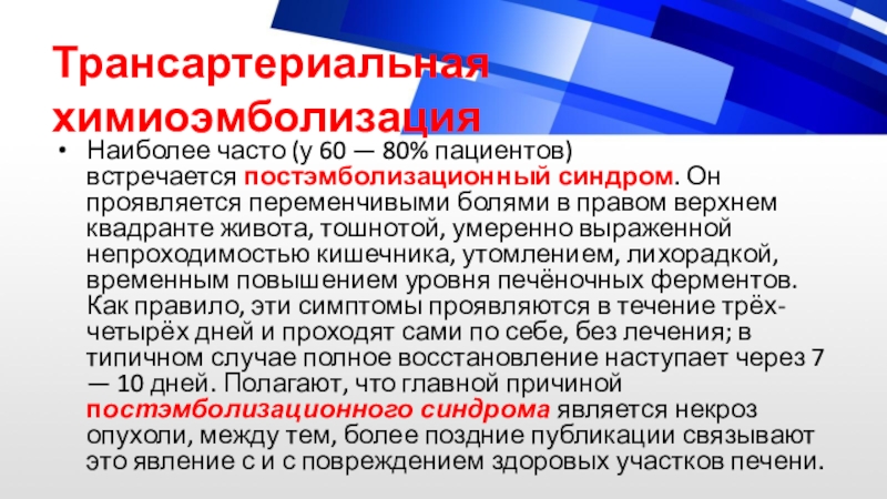 умеренно выраженной непроходимостью кишечника, утомлением, лихорадкой, временным повышением уровня печёночных ферментов. Как правило, эти симптомы проявляются в течение трёх-четырёх дней и проходят сами по себе, без лечения; в типичном случае полное восстановление наступает через 7 — 10 дней. Полагают, что главной причиной постэмболизационного синдрома является некроз опухоли, между тем, более поздние публикации связывают это явление с и с повреждением здоровых участков печени.
