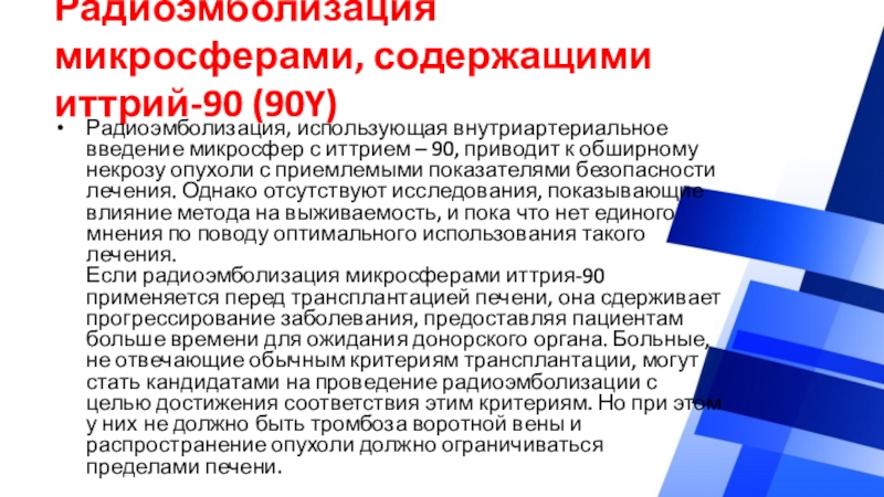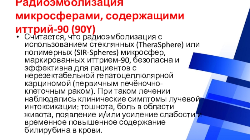 Слайд 65Радиоэмболизация микросферами, содержащими иттрий-90 (90Y)