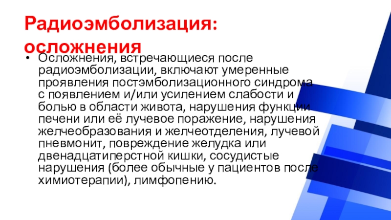 Осложнения, встречающиеся после радиоэмболизации, включают умеренные проявления постэмболизационного синдрома