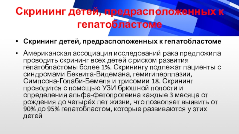 Слайд 22Скрининг детей, предрасположенных к гепатобластоме