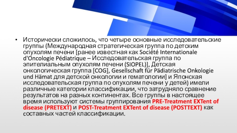Pédiatrique – Исследовательская группа по эпителиальным опухолям печени (SIOPEL)], Детская онкологическая группа [COG], Gesellschaft für Pädiatrische Onkologie und Hämat для детской онкологии и гематологии] и Японская исследовательская группа по опухолям печени у детей) имели различные категории классификации, что затрудняло сравнение результатов на разных континентах. Все группы в настоящее время используют системы группирования PRE-Treatment EXTent of disease (PRETEXT) и POST-Treatment EXTent of disease (POSTTEXT) как cоставных частей классификации.