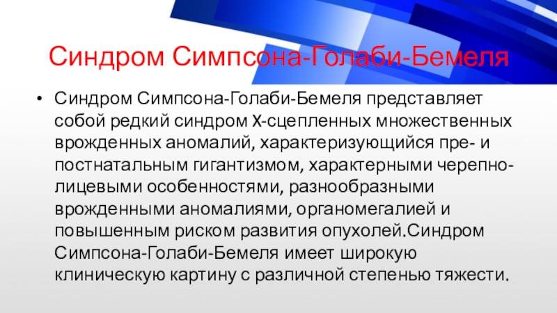 врожденными аномалиями, органомегалией и повышенным риском развития опухолей.Синдром Симпсона-Голаби-Бемеля имеет широкую клиническую картину с различной степенью тяжести.