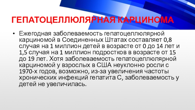 14 лет и 1,5 случая на 1 миллион подростков в возрасте от 15 до 19 лет. Хотя заболеваемость гепатоцеллюлярной карциномой у взрослых в США неуклонно росли с 1970-х годов, возможно, из-за увеличения частоты хронических инфекций гепатита С, заболеваемость у детей не увеличилась.