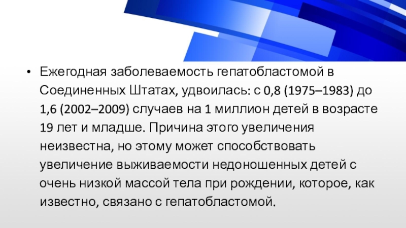 Слайд 9Ежегодная заболеваемость гепатобластомой в Соединенных Штатах, удвоилась: с 0,8 (1975–1983)