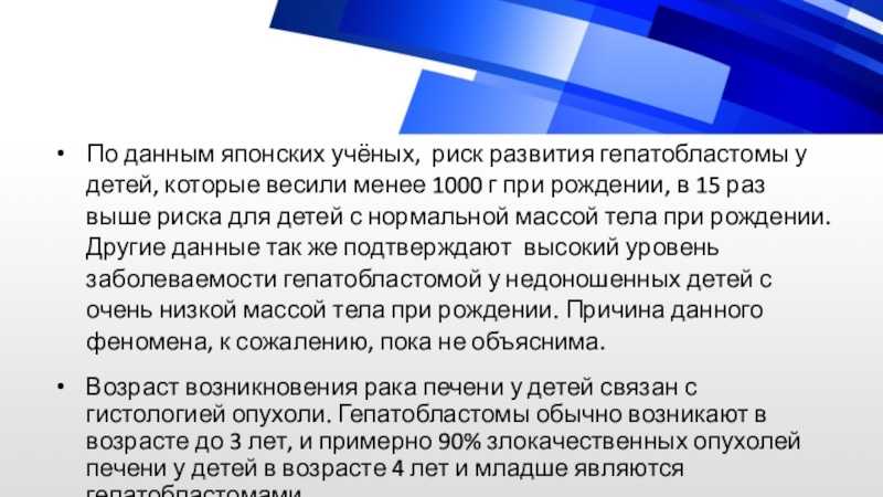 Слайд 10По данным японских учёных, риск развития гепатобластомы у детей, которые