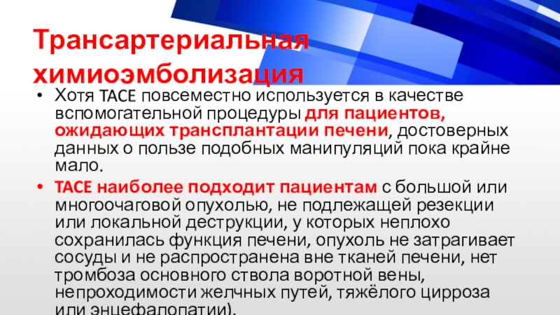 TACE наиболее подходит пациентам с большой или многоочаговой опухолью, не подлежащей резекции или локальной деструкции, у которых неплохо сохранилась функция печени, опухоль не затрагивает сосуды и не распространена вне тканей печени, нет тромбоза основного ствола воротной вены, непроходимости желчных путей, тяжёлого цирроза или энцефалопатии).