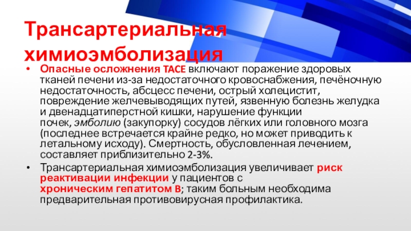 Опасные осложнения TACE включают поражение здоровых тканей печени из-за недостаточного кровоснабжения,