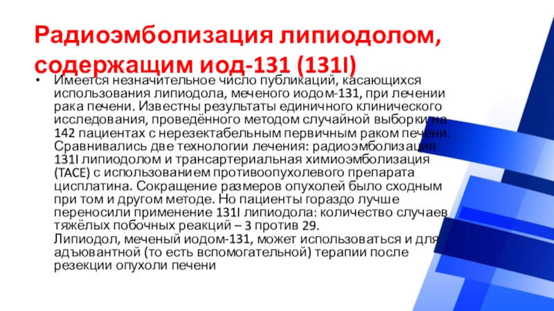 клинического исследования, проведённого методом случайной выборки на 142 пациентах с нерезектабельным первичным раком печени. Сравнивались две технологии лечения: радиоэмболизация 131I липиодолом и трансартериальная химиоэмболизация (TACE) с использованием противоопухолевого препарата цисплатина. Сокращение размеров опухолей было сходным при том и другом методе. Но пациенты гораздо лучше переносили применение 131I липиодола: количество случаев тяжёлых побочных реакций – 3 против 29.
