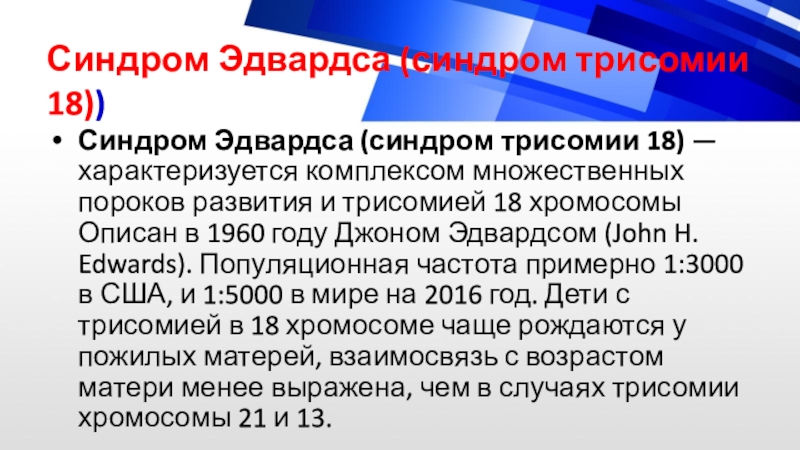 развития и трисомией 18 хромосомы Описан в 1960 году Джоном Эдвардсом