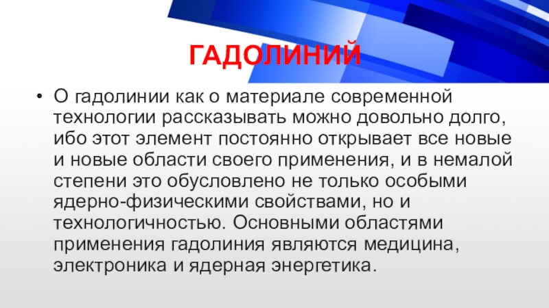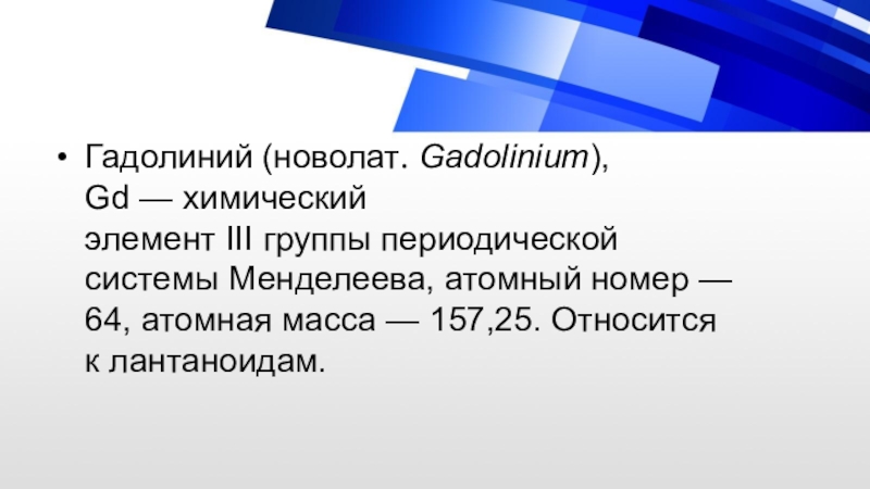 Слайд 7Гадолиний (новолат. Gadolinium), Gd — химический элемент III группы периодической системы Менделеева, атомный номер — 64, атомная масса — 157,25. Относится к лантаноидам.