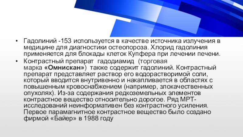Слайд 8Гадолиний -153 используется в качестве источника излучения в медицине для диагностики