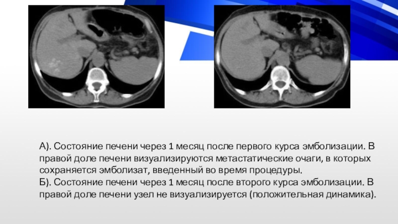Слайд 60А). Состояние печени через 1 месяц после первого курса эмболизации.