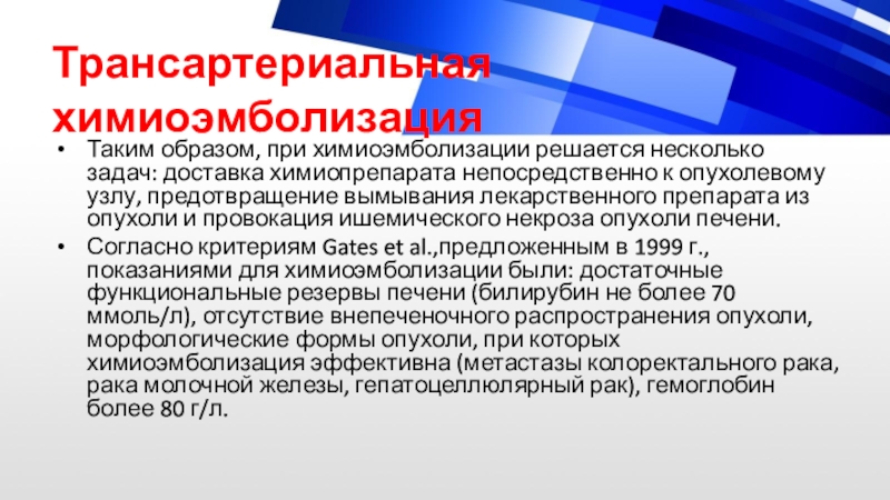 Согласно критериям Gates et al.,предложенным в 1999 г., показаниями для химиоэмболизации были: достаточные функциональные резервы печени (билирубин не более 70 ммоль/л), отсутствие внепеченочного распространения опухоли, морфологические формы опухоли, при которых химиоэмболизация эффективна (метастазы колоректального рака, рака молочной железы, гепатоцеллюлярный рак), гемоглобин более 80 г/л.