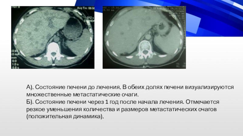 Слайд 61А). Состояние печени до лечения. В обеих долях печени визуализируются