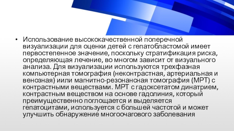 Слайд 5Использование высококачественной поперечной визуализации для оценки детей с гепатобластомой имеет